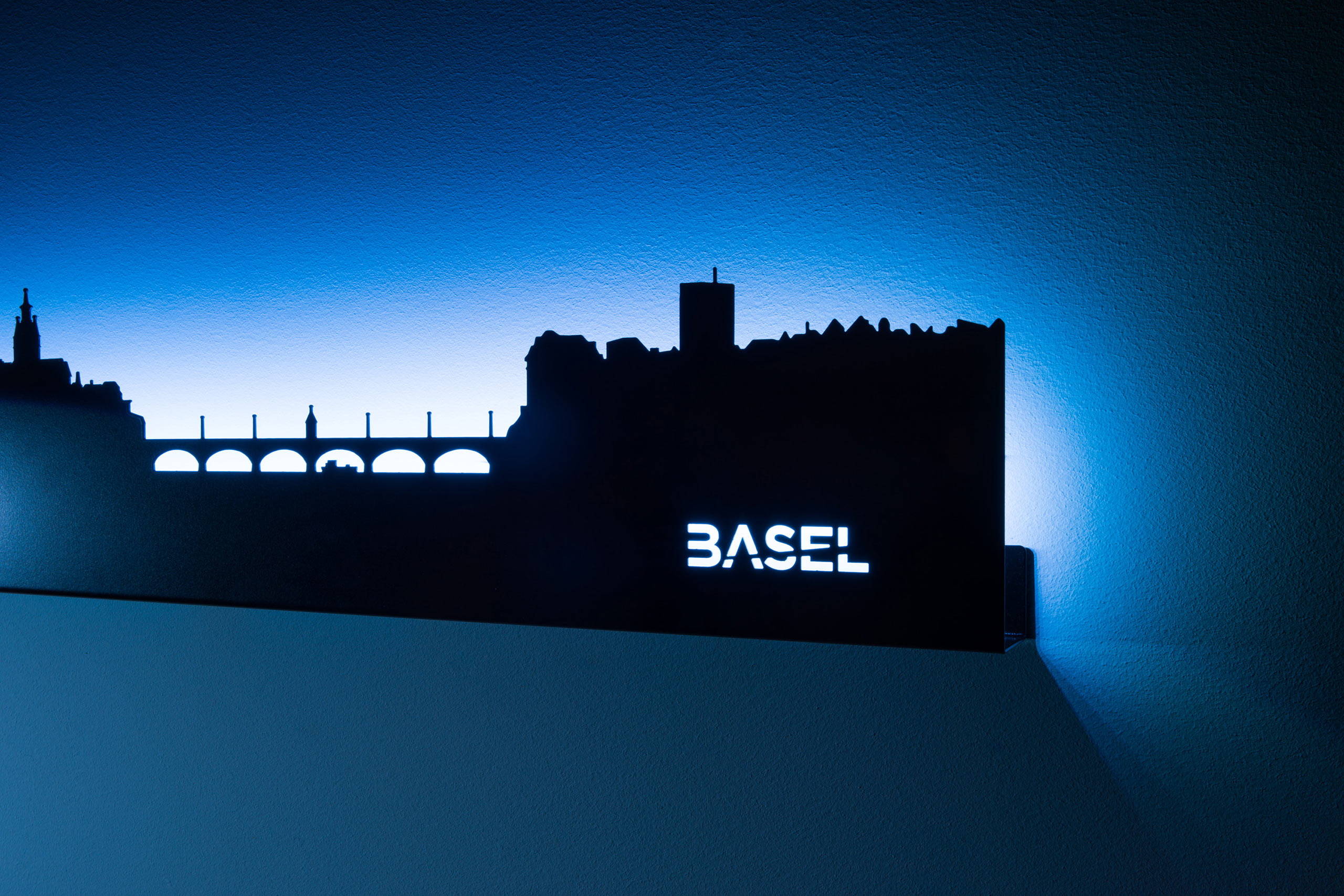 Die Skyline von Basel als Wandleuchte: Von der Wettsteinbrücke aus schauen wir zur Elisabethenkirche bis hin zum Novartis-Tower. Dabei passieren wir die Barfüsserkirche, das Münster und überqueren die Mittlere Brücke, bis wir beim Läckerli Huus ankommen. Wir haben bei der Gestaltung auf eine möglichst hohe Authentizität geachtet, um Ihnen Ihre Lieblingsstadt nahe zu bringen und Ihre Gäste ins Staunen zu versetzen. Mit LICHTSCHNITT entscheiden sie sich für ein in der Schweiz gefertigtes Produkt. Einmal an die Wand montiert, gibt LICHTSCHNITT eine unverwechselbare Stadtsilhouette wieder, welche dank der indirekten Hintergrundbeleuchtung (LED mit Netzstecker) zum Eyecatcher avanciert.