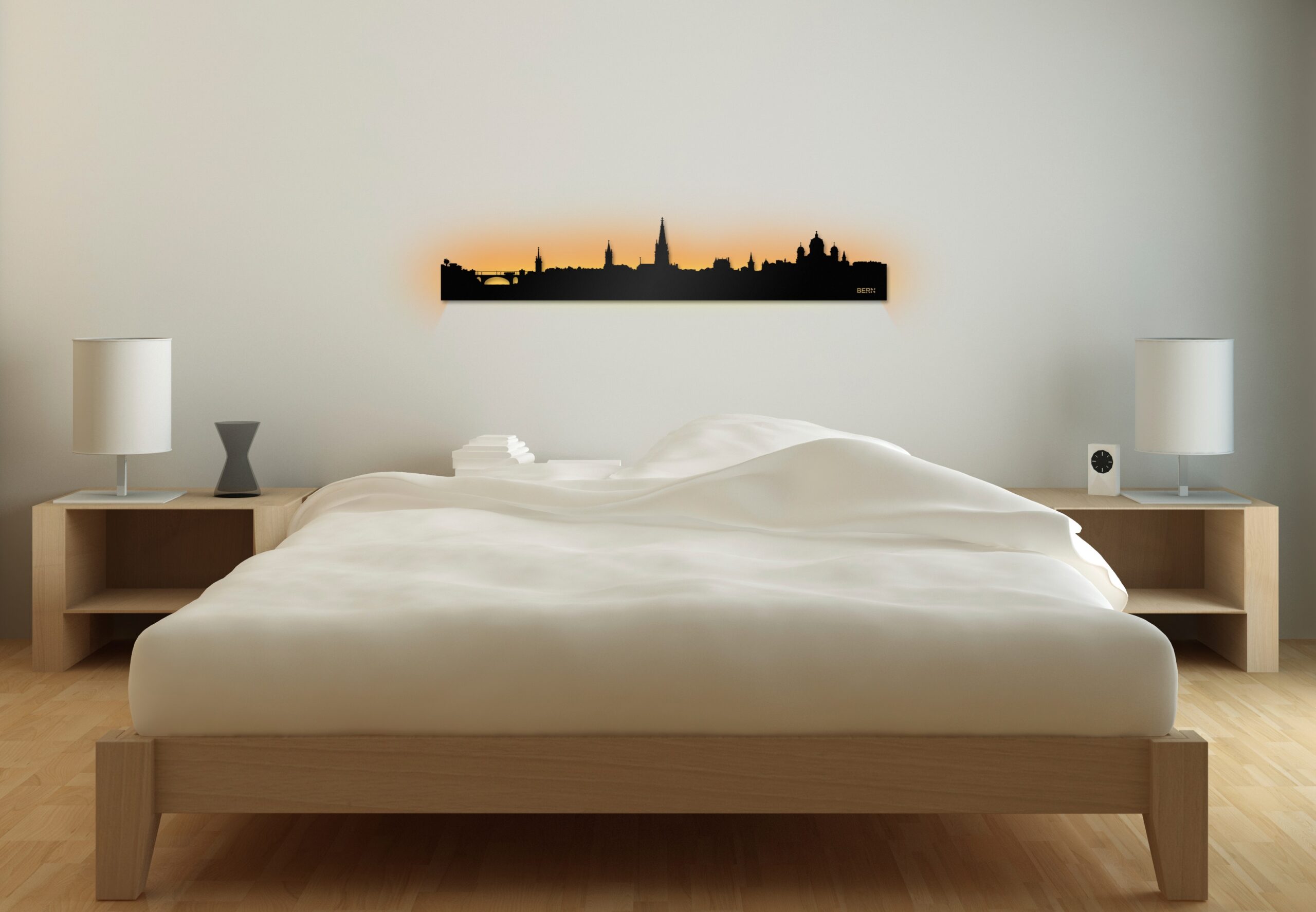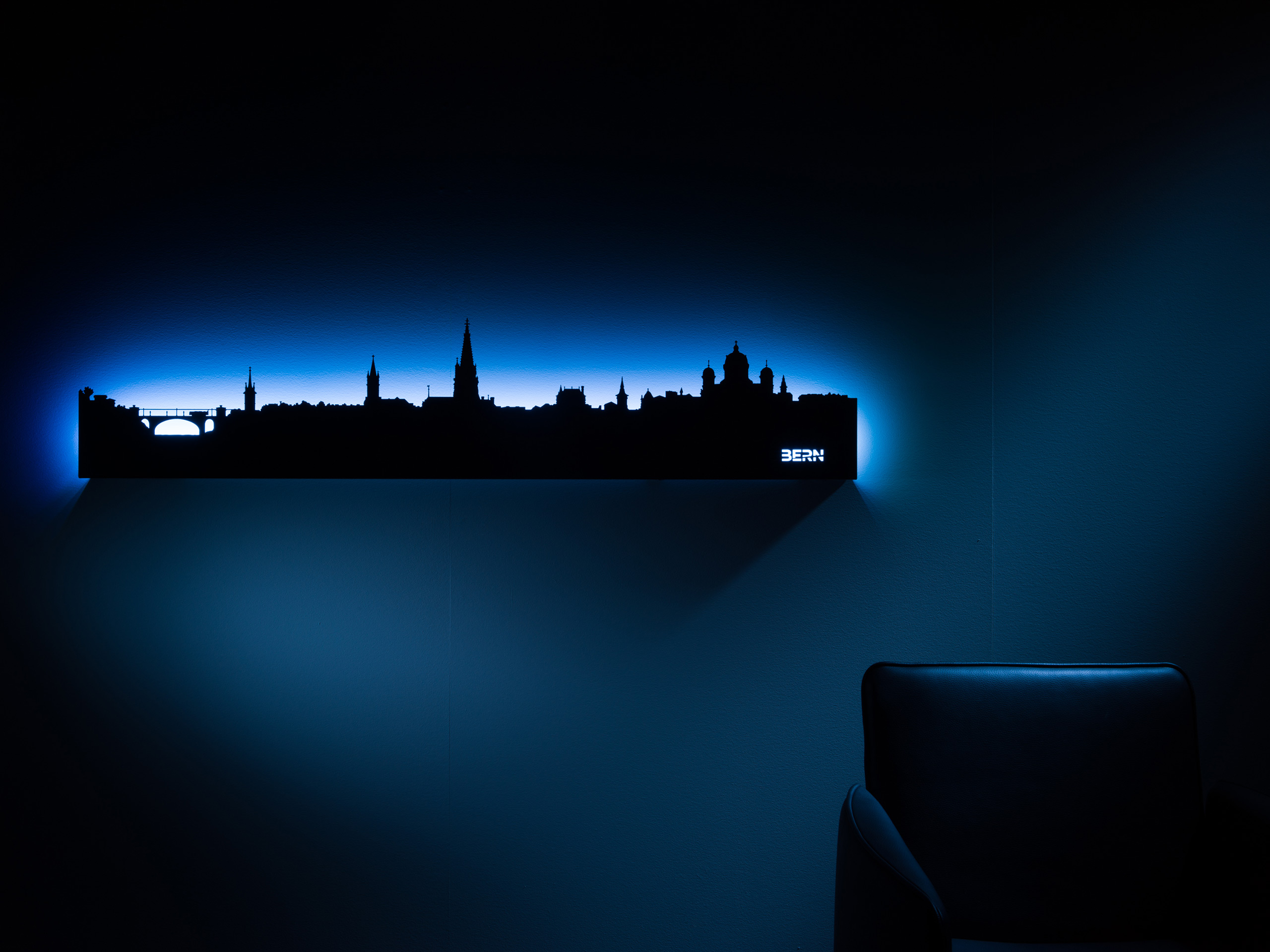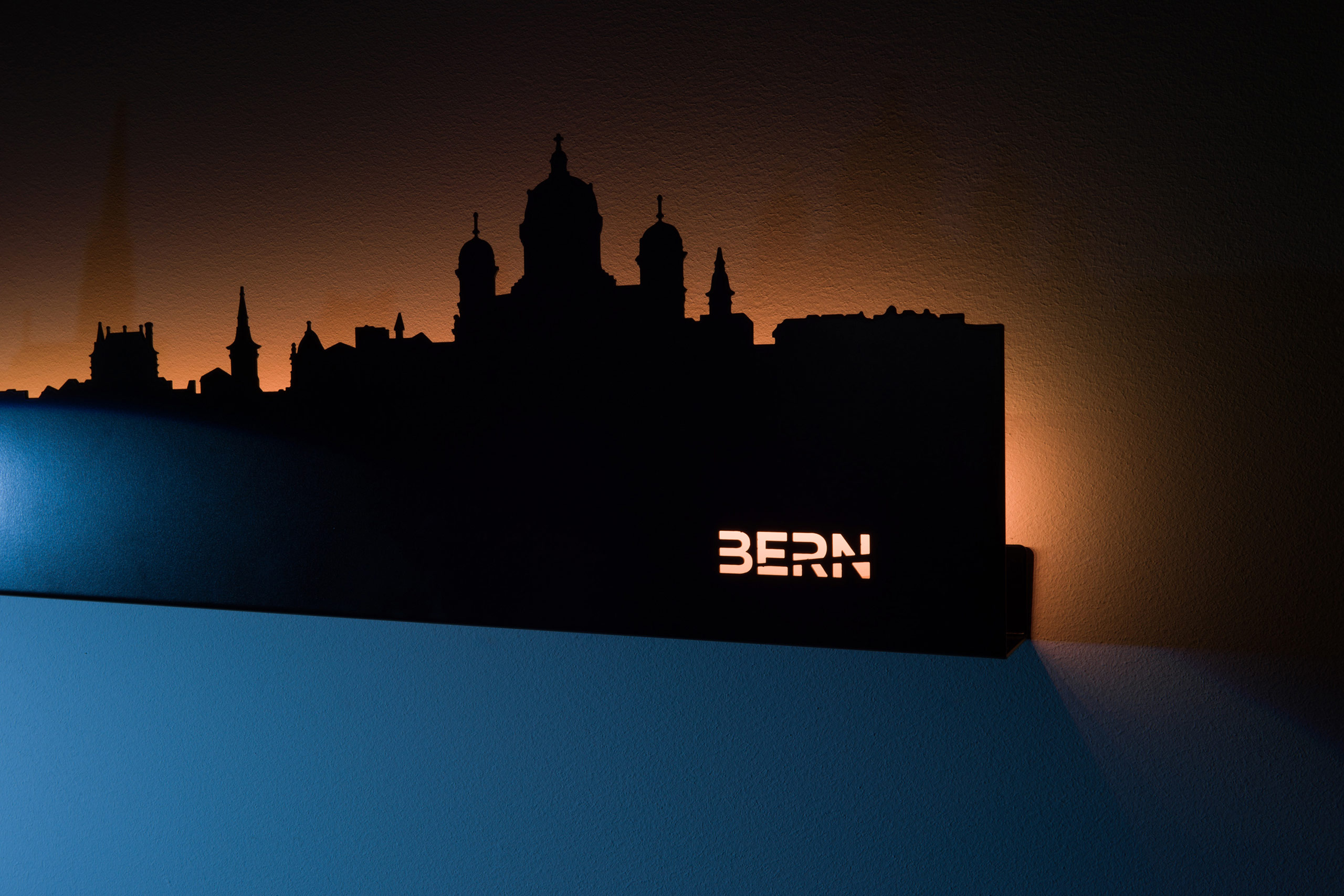 Die Skyline von Bern als Wandleuchte: Von der Kornhausbrücke aus schauen wir zum Bärengraben, überqueren die Nydeggbrücke, passieren das Münster und die weltbekannte Zytglogge bis wir beim Bundeshaus ankommen. Wir haben bei der Gestaltung auf eine möglichst hohe Authentizität geachtet, um Ihnen Ihre Lieblingsstadt nahe zu bringen und Ihre Gäste ins Staunen zu versetzen. Mit LICHTSCHNITT entscheiden sie sich für ein in der Schweiz gefertigtes Produkt. Einmal an die Wand montiert, gibt LICHTSCHNITT eine unverwechselbare Stadtsilhouette wieder, welche dank der indirekten Hintergrundbeleuchtung (LED mit Netzstecker) zum Eyecatcher avanciert.