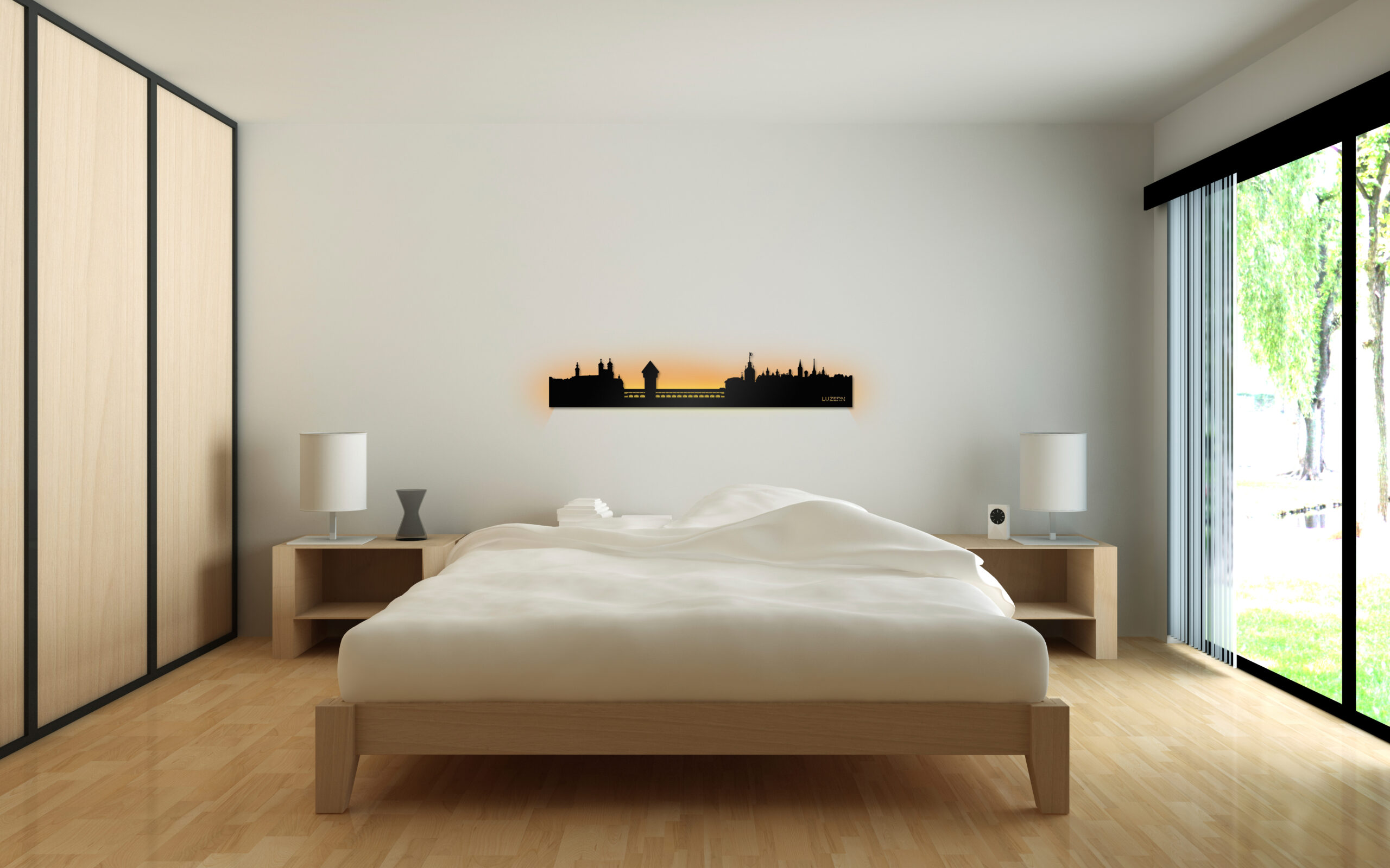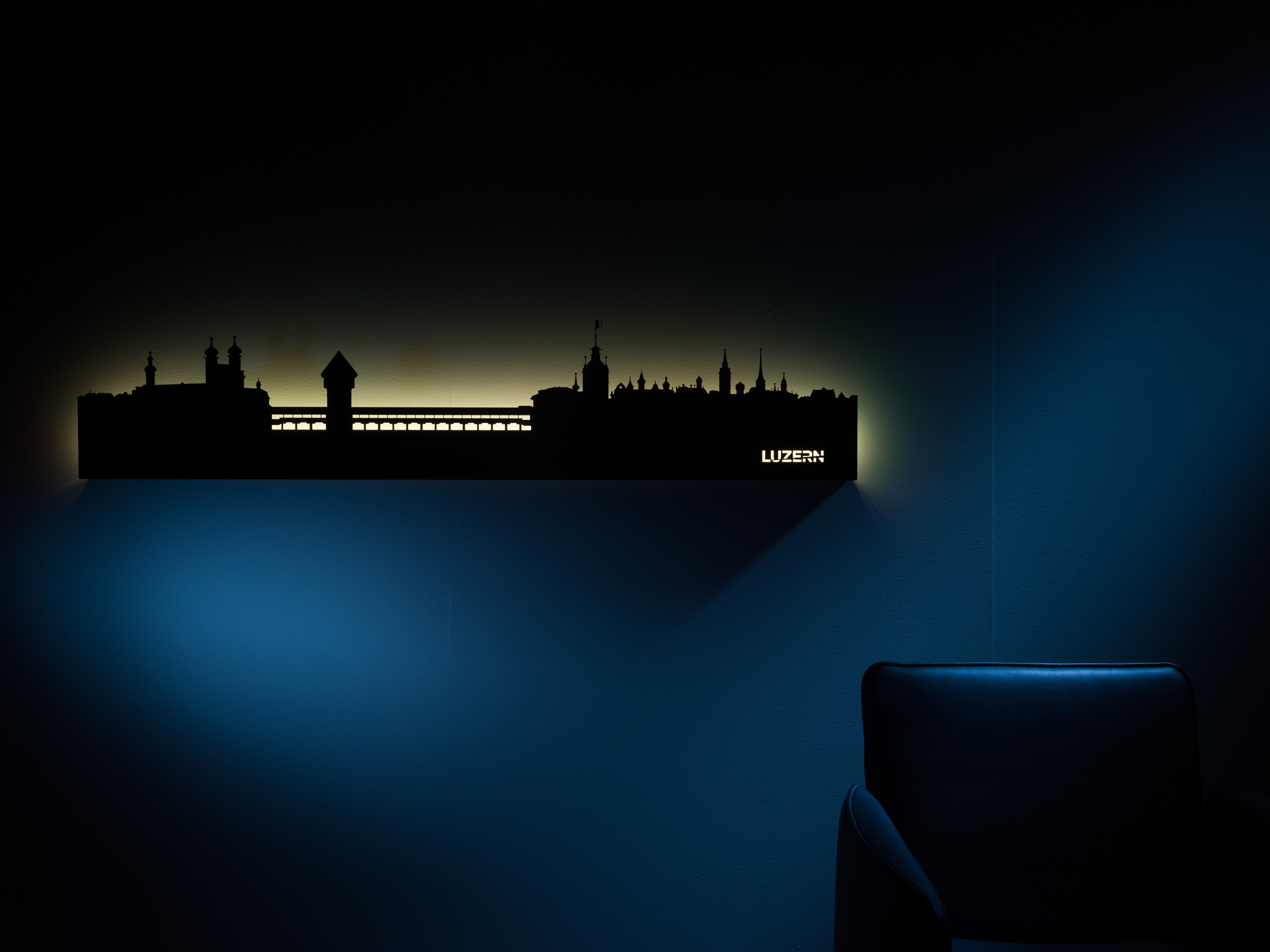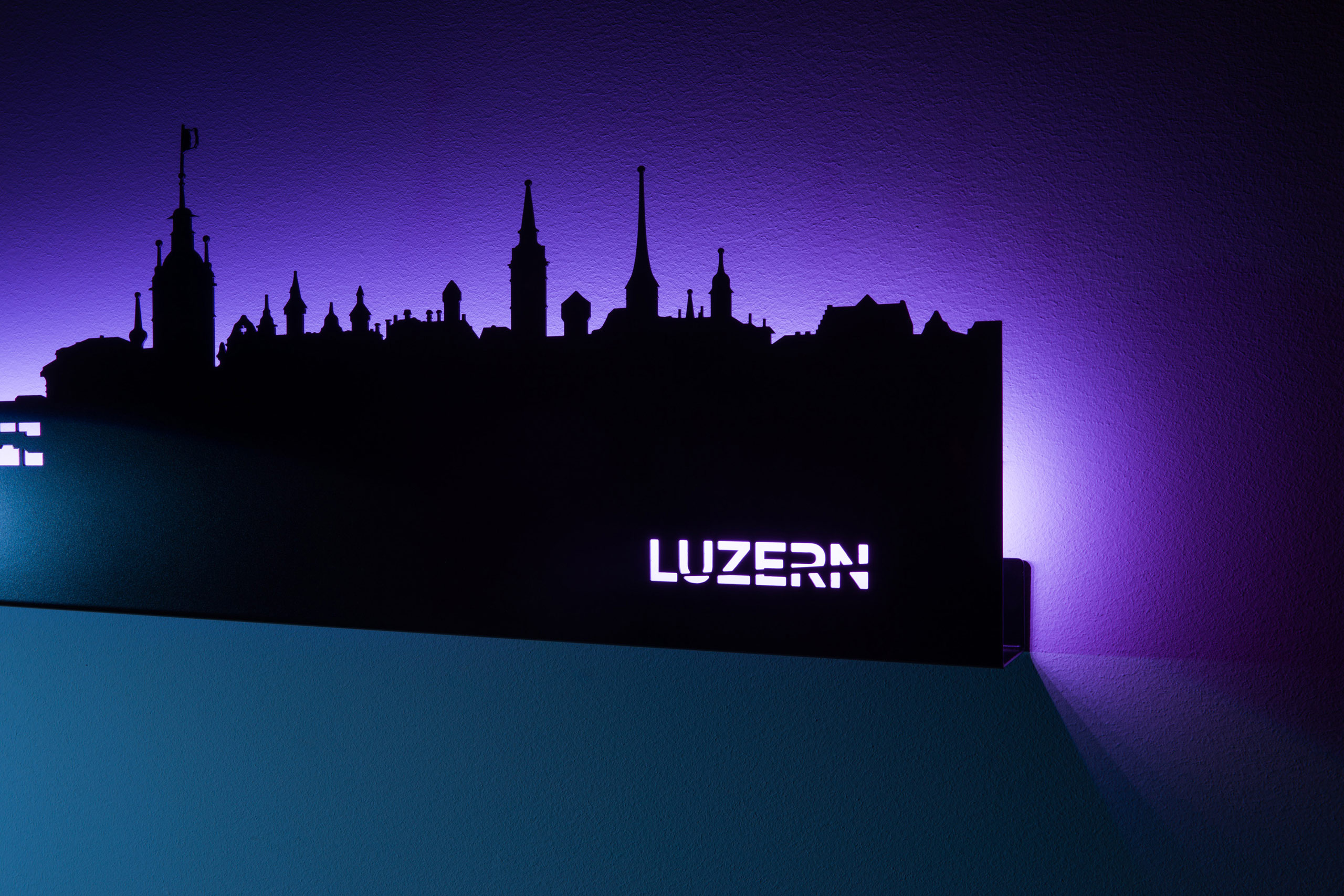 Die Skyline von Luzern als Wandleuchte: Von der Seebrücke aus schauen wir zur Jesuitenkirche bis hin zum Schirmer-Turm. Dabei überqueren wir die Kapellbrücke mit dem Wasserturm, passieren das Rathaus, den Wacht- und Zyt-Turm, bis hin zur St. Peters-Kapelle. Wir haben bei der Gestaltung auf eine möglichst hohe Authentizität geachtet, um Ihnen Ihre Lieblingsstadt nahe zu bringen und Ihre Gäste ins Staunen zu versetzen. Mit LICHTSCHNITT entscheiden sie sich für ein in der Schweiz gefertigtes Produkt. Einmal an die Wand montiert, gibt LICHTSCHNITT eine unverwechselbare Stadtsilhouette wieder, welche dank der indirekten Hintergrundbeleuchtung (LED mit Netzstecker) zum Eyecatcher avanciert.