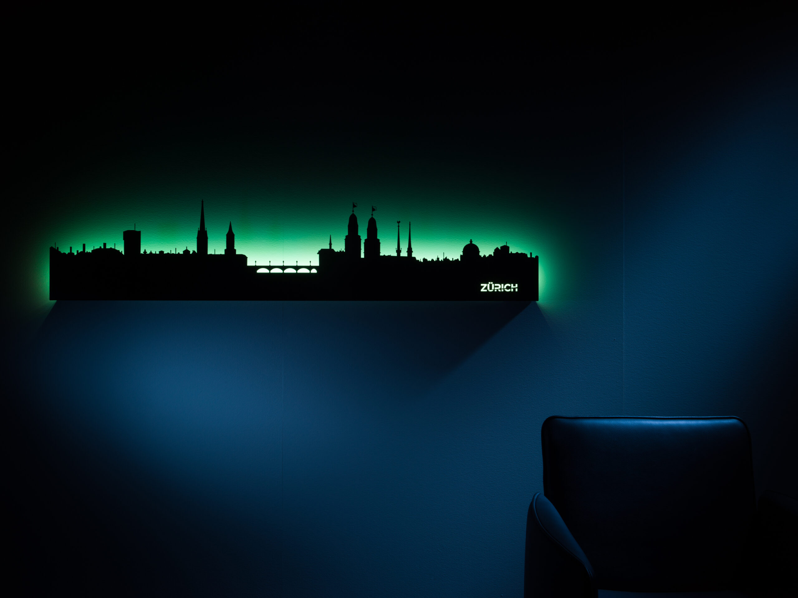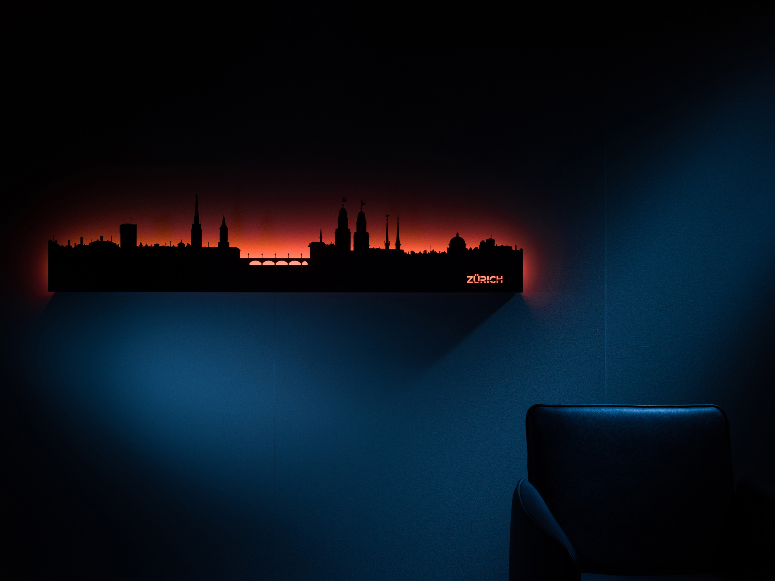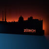 Die Skyline von Zürich als Wandleuchte: Von der Quaibrücke aus schauen wir zum Primetower bis hin zum ETH Gebäude. Dabei passieren wir das Fraumünster, überqueren die Münsterbrücke und gelangen zur Predigerkirche via Grossmünster. Wir haben bei der Gestaltung auf eine möglichst hohe Authentizität geachtet, um Ihnen Ihre Lieblingsstadt nahe zu bringen und Ihre Gäste ins Staunen zu versetzen. Mit LICHTSCHNITT entscheiden sie sich für ein in der Schweiz gefertigtes Produkt. Einmal an die Wand montiert, gibt LICHTSCHNITT eine unverwechselbare Silhouette wieder, welche dank der indirekten Hintergrundbeleuchtung (LED mit Netzstecker) zum Eyecatcher avanciert. Ein Wandtattoo in 3D!